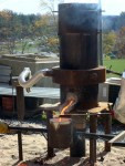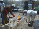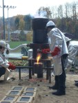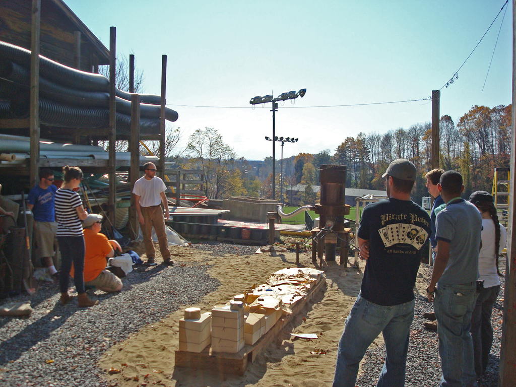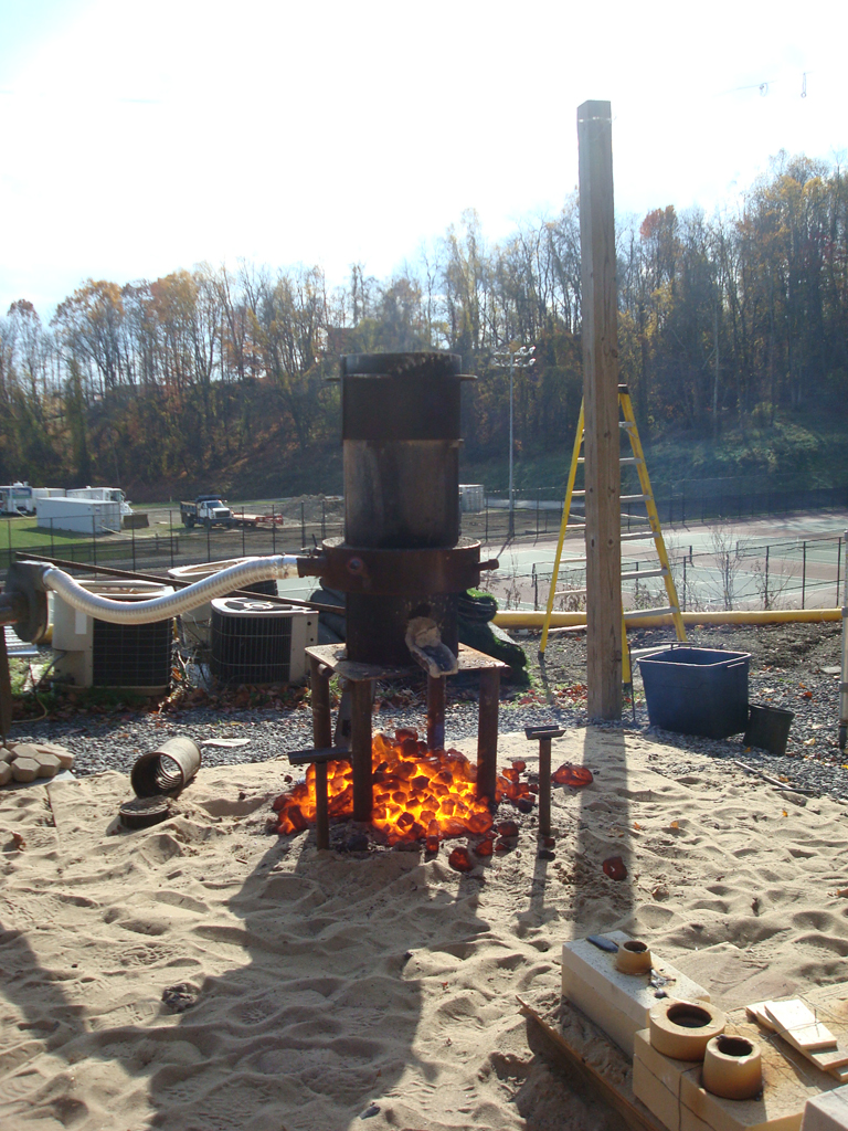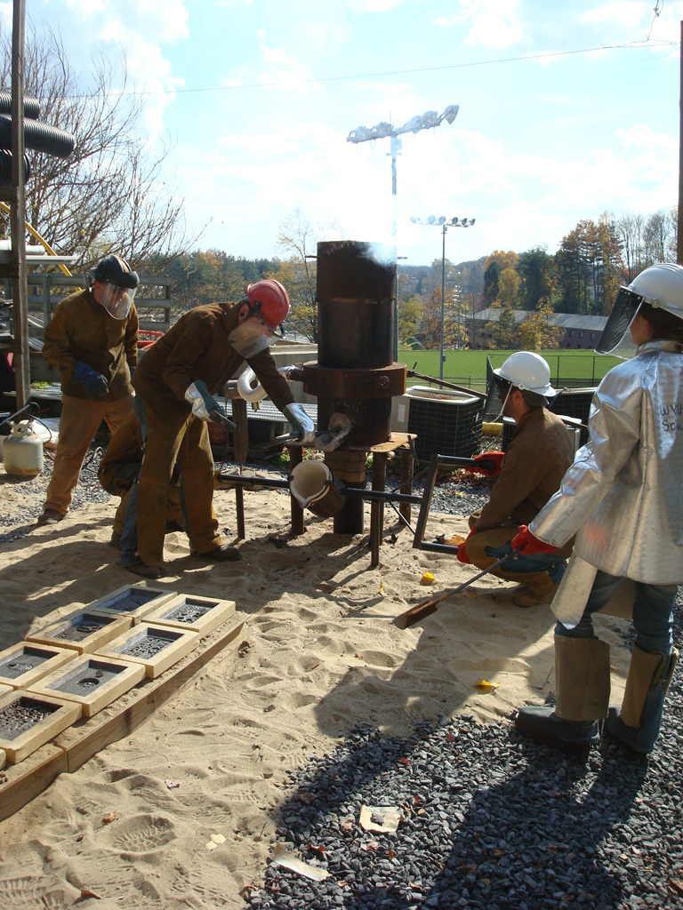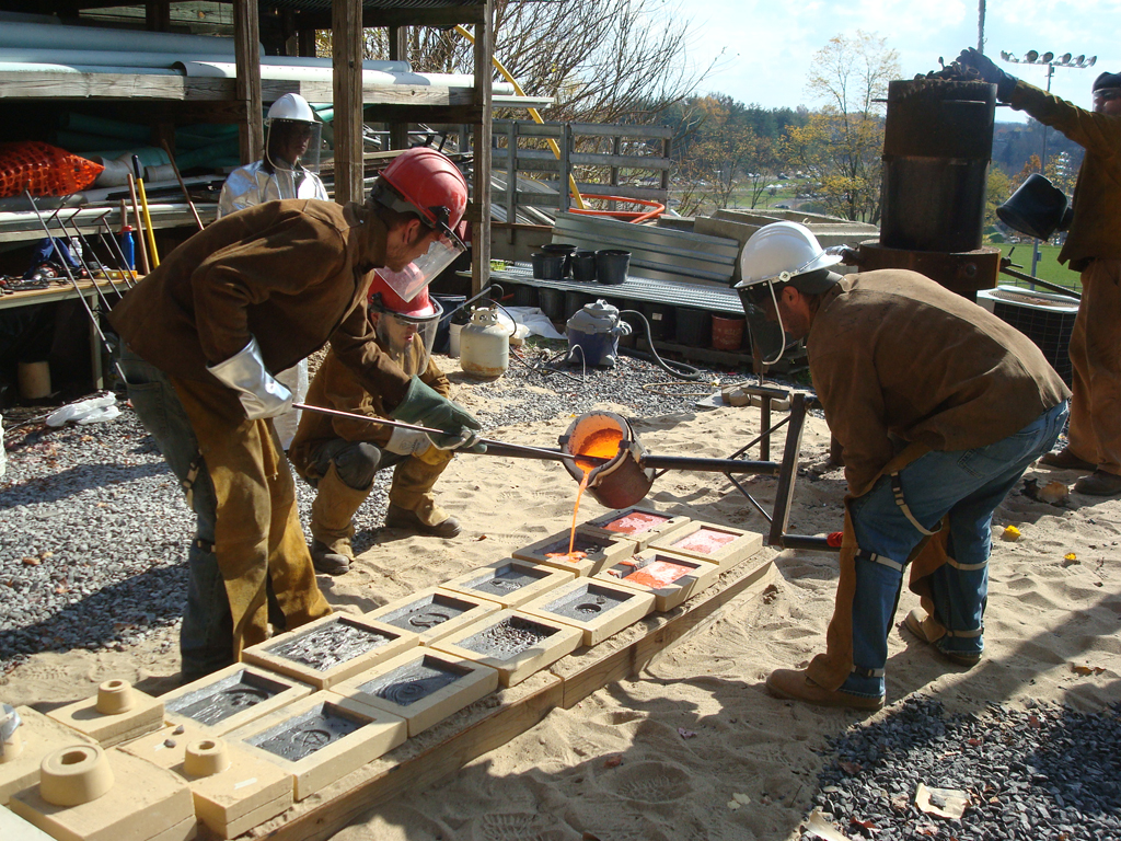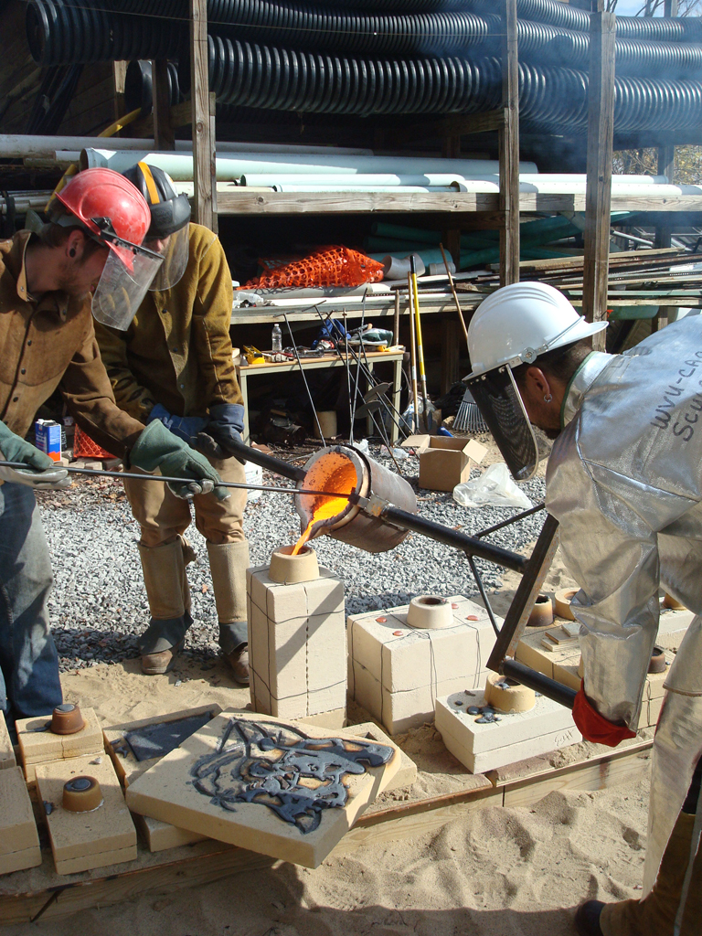 Last Friday, I took part in a collaborative iron pour with my sculpture students and Jeremy Entwistle’s sculpture students from the Fairmont State University Department of Art . This was my first time casting iron, and I was truly amazed at the way this process requires such intense teamwork and collaboration. We had excellent weather, there was great camaraderie among all participants, and everything went off without a hitch, so I definitely anticipate more collaborative iron casting in the near future.