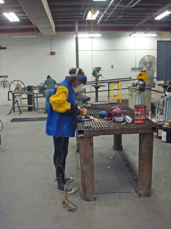 campus-community project Original size at 768 × 1024 Leave a comment Student Kelsie Lily grinding base plates for posts