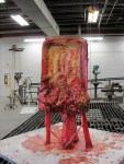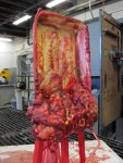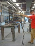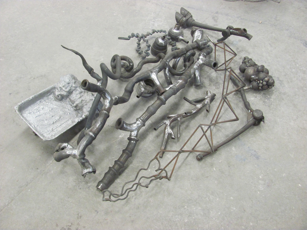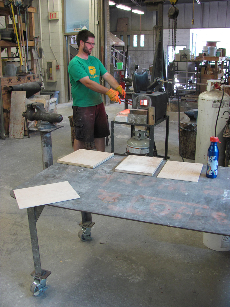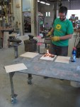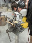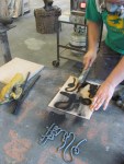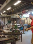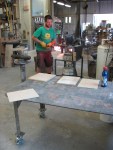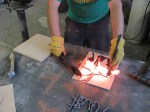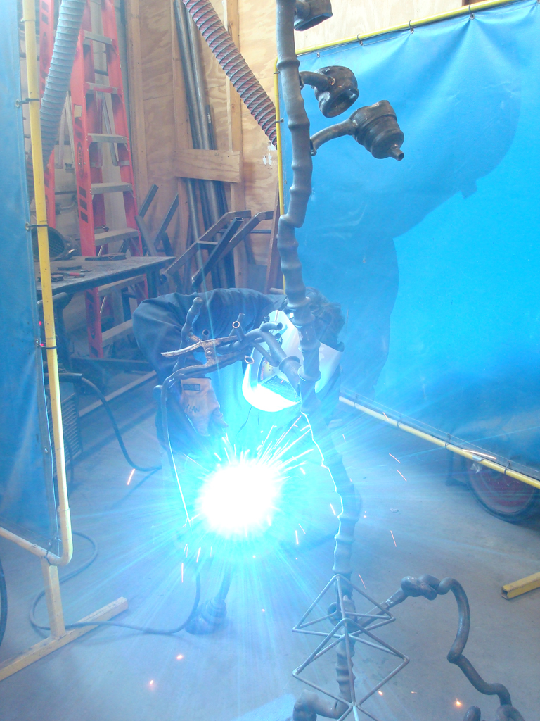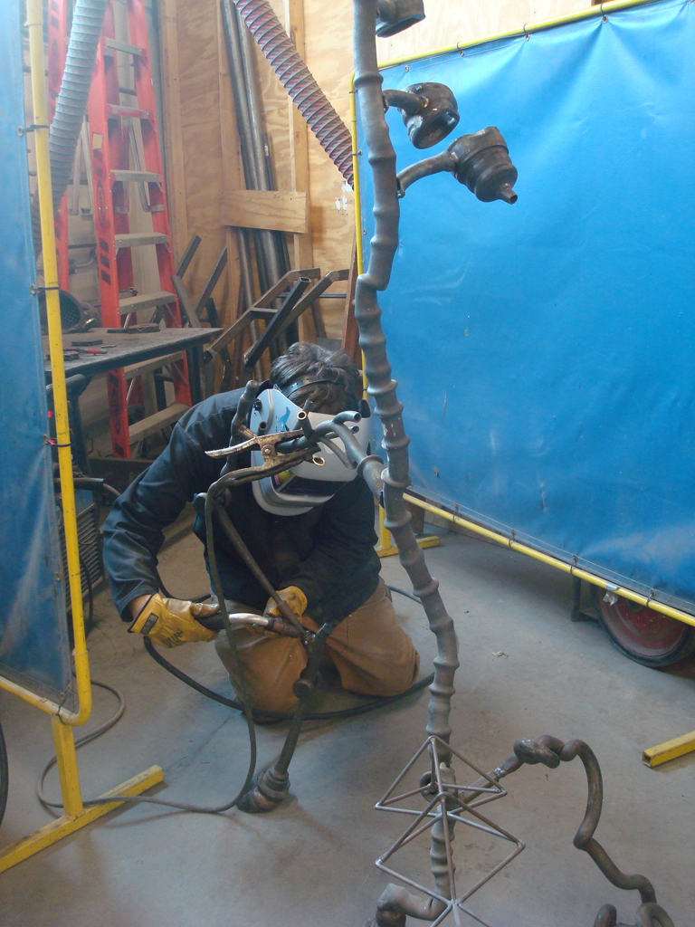 To begin the birdhouse component of this project, my sculpture students were tasked with creating steel butterflies, flowers, snails, and leaves, which tied into our classroom study of forging, welding, and other metal fabrication techniques. Meanwhile, 4th grade students from North were utilizing their bird research, drawing these creatures onto steel panels with chalk. I took these panels back to our studio and cut them out with a plasma torch, and then these bird panels and my sculpture students’ flora and fauna were cleaned up and painted in multiple bright colors.